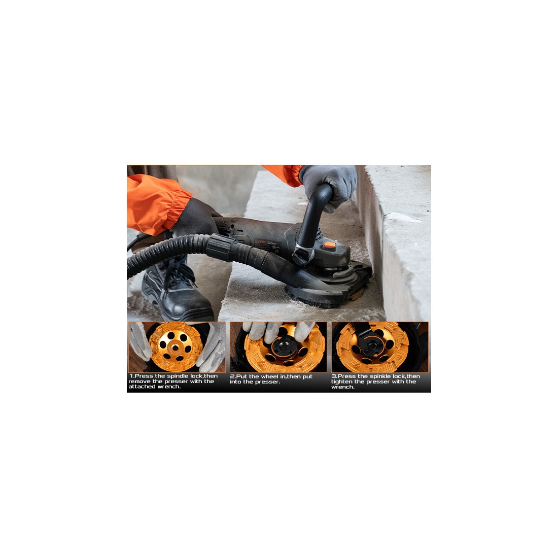 Wesentliches auf einen Blick: - Für 125‑mm Diamant-Schleifteller; gängiges M14‑Gewinde kompatibel mit Standardzubehör. - Robustes Getriebegehäuse und langlebige Komponenten für den harten Baustelleneinsatz. - Einstellbare Haube für randnahes Schleifen; einfacher Tellerwechsel.