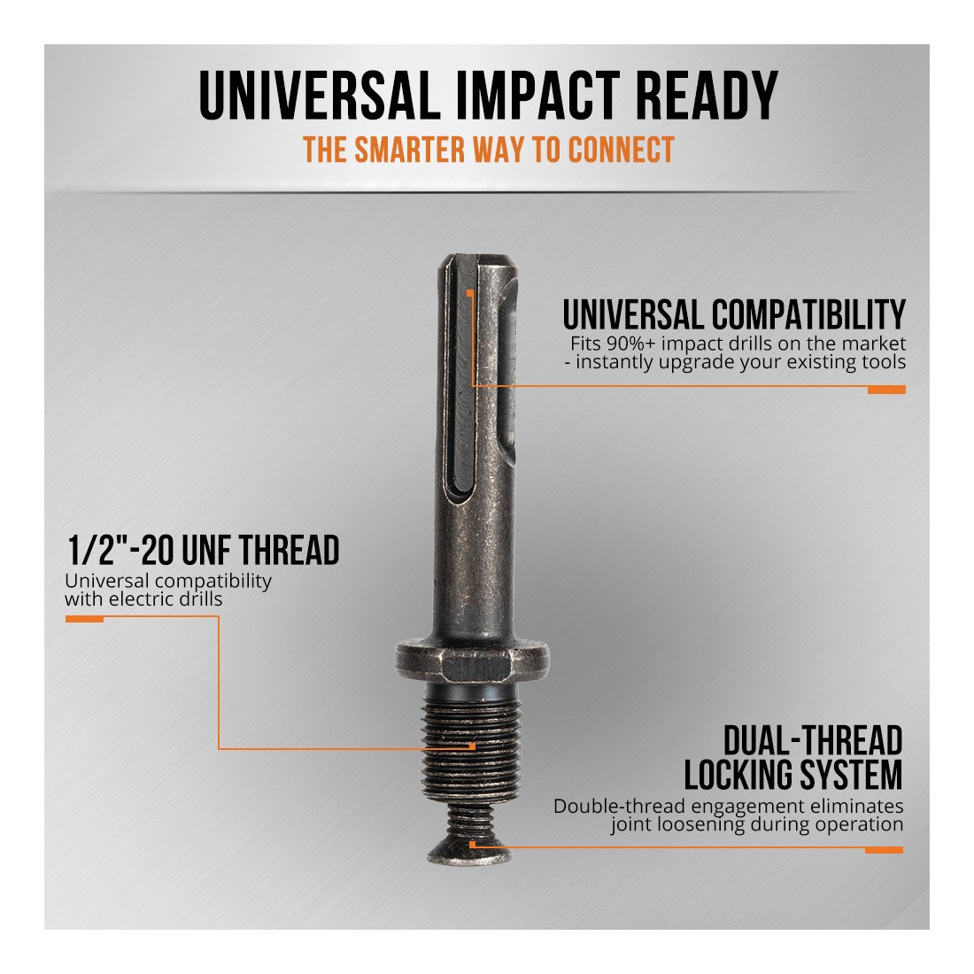 - Allows easy conversion from SDS-Plus shanks to 1/2"-20 UNF thread systems.