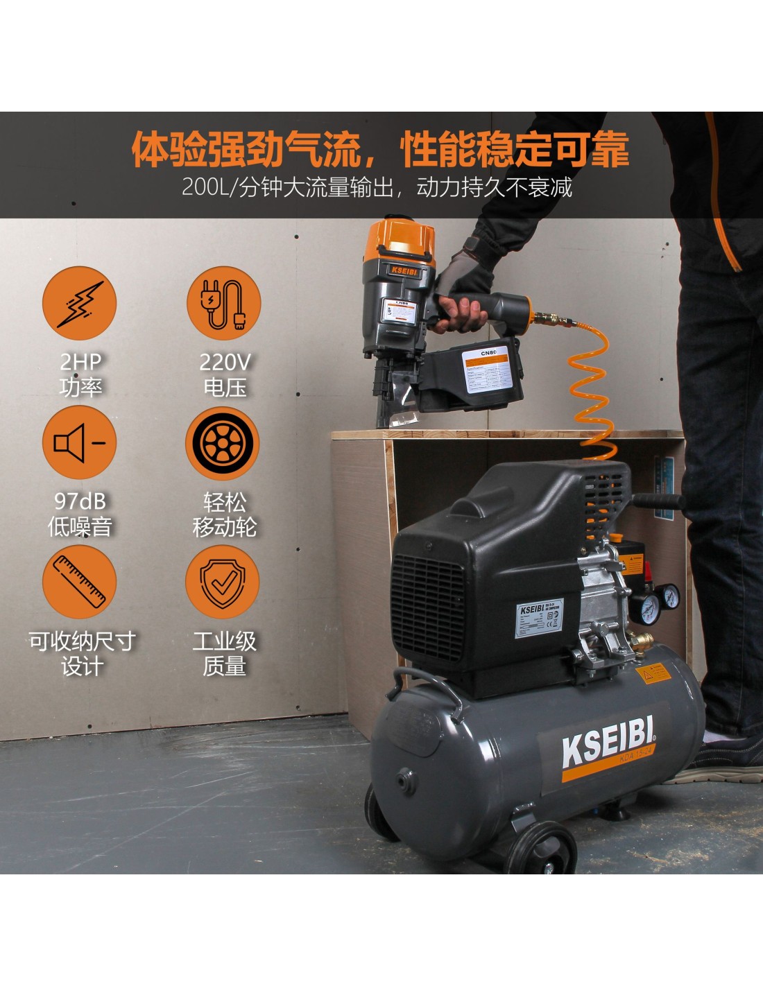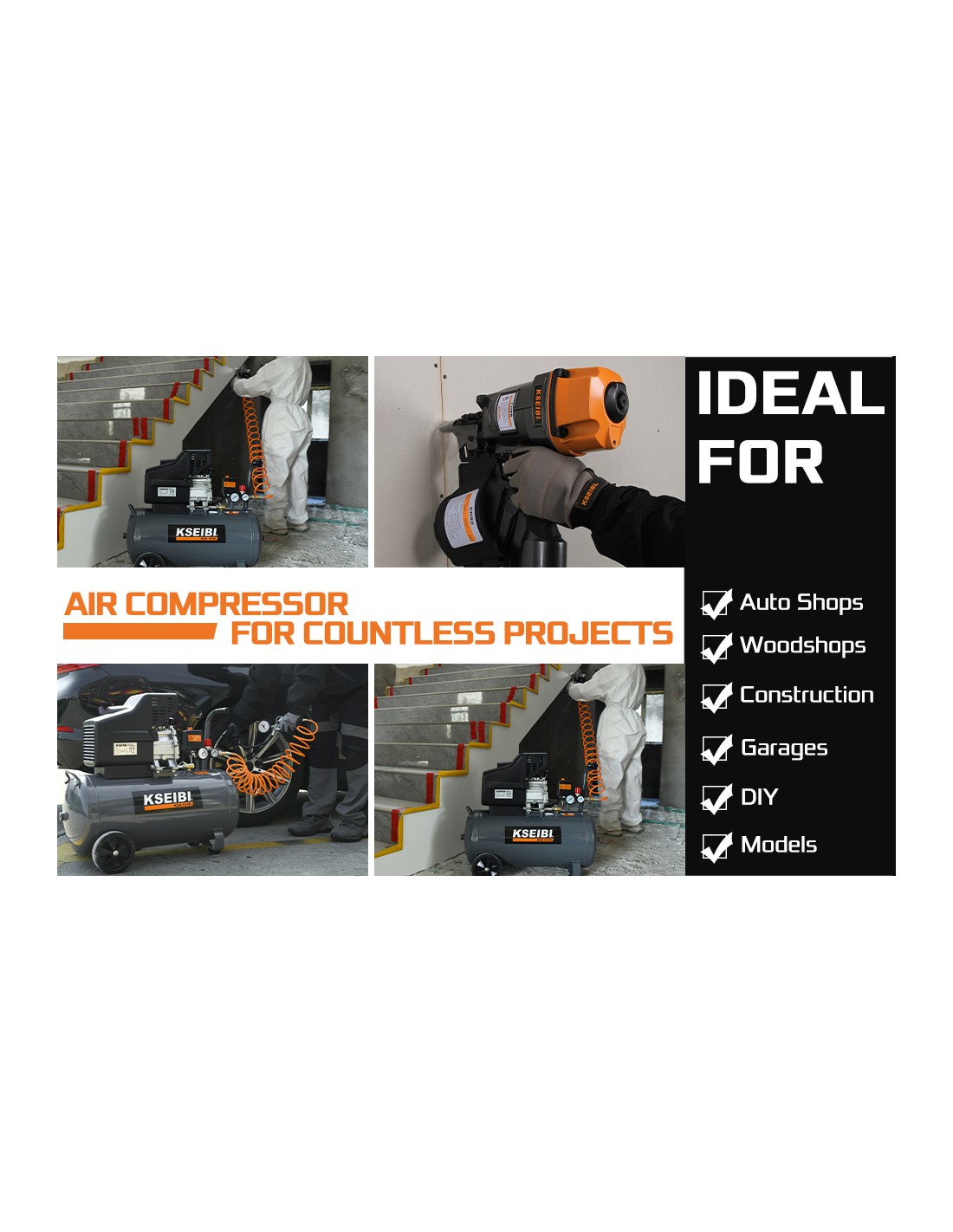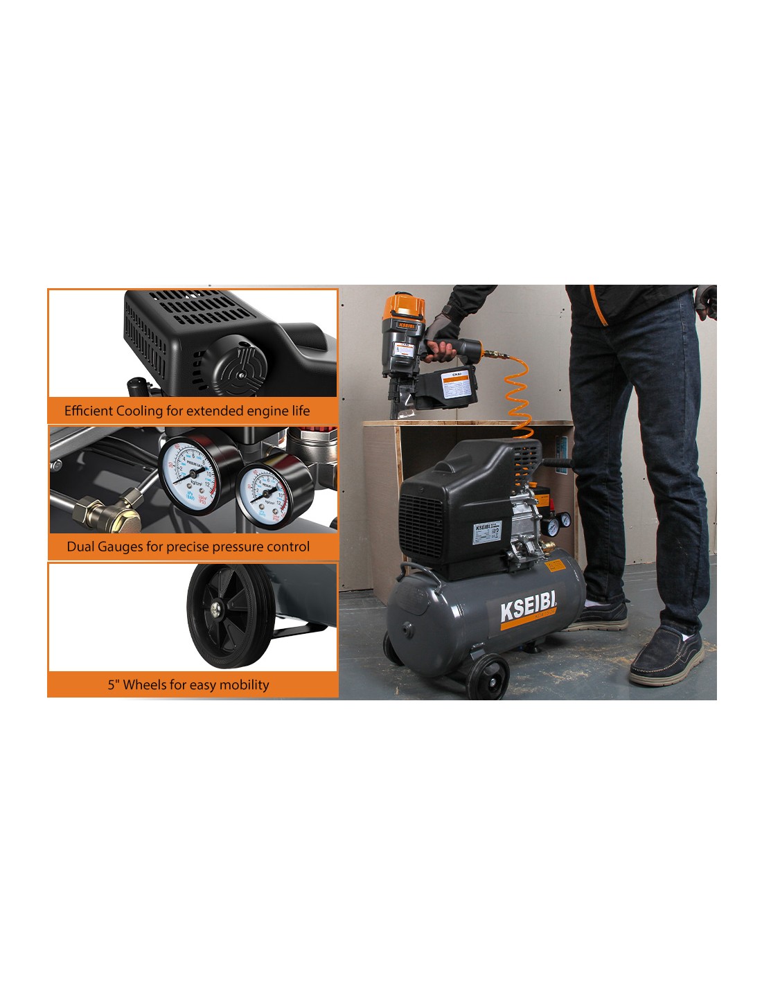 KSEIBI KDA 15-24, Compresor de aire 24 l, 2 HP Este compresor portátil ofrece un suministro de aire estable para soplar, inflar, accionar clavadoras y herramientas neumáticas ligeras en talleres,