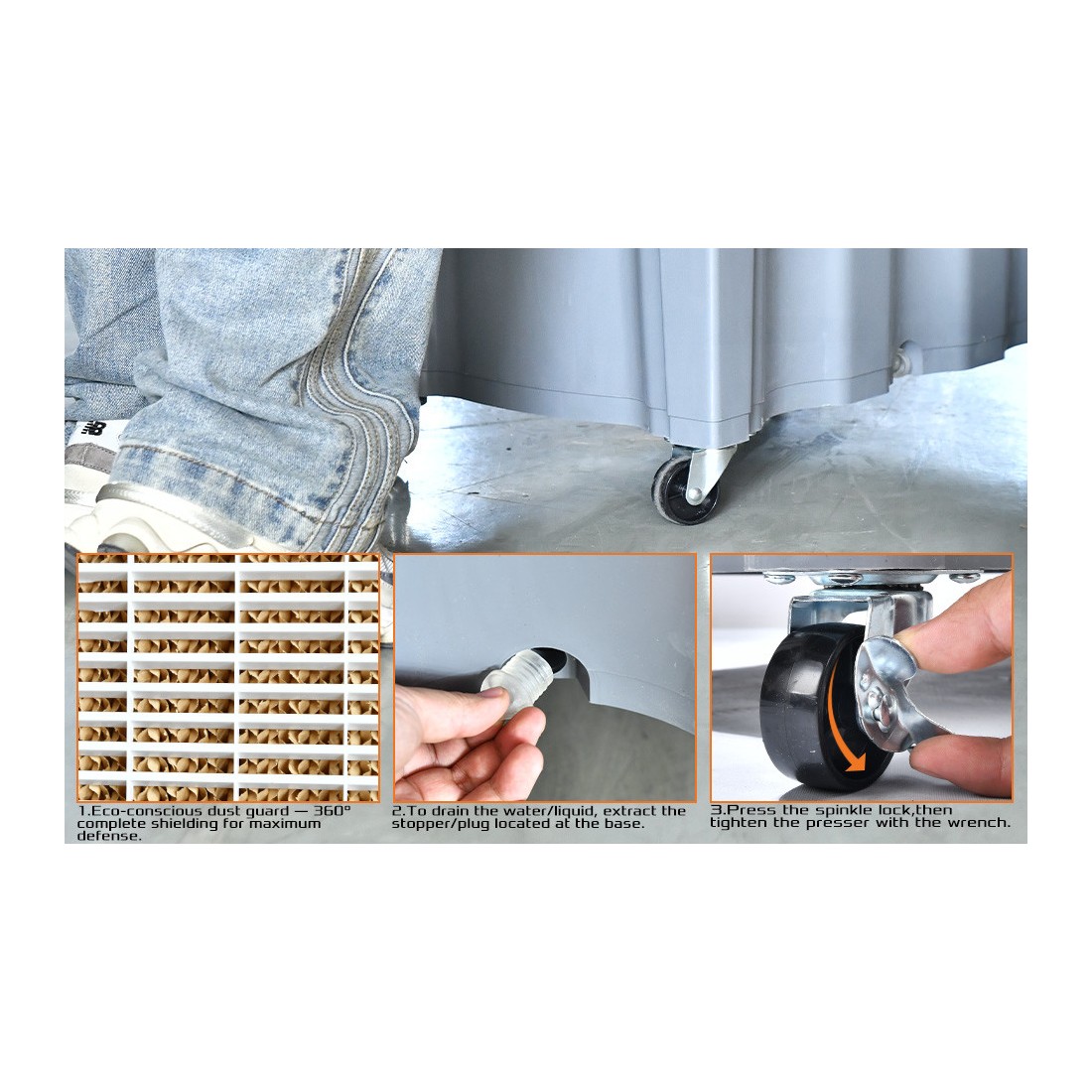 Este enfriador es perfecto para industrias, comercios o espacios donde un aire acondicionado tradicional no sea viable. Su capacidad de enfriamiento eficiente y su gran depósito aseguran un rendimiento continuo y sin complicaciones, incluso en jornadas largas.