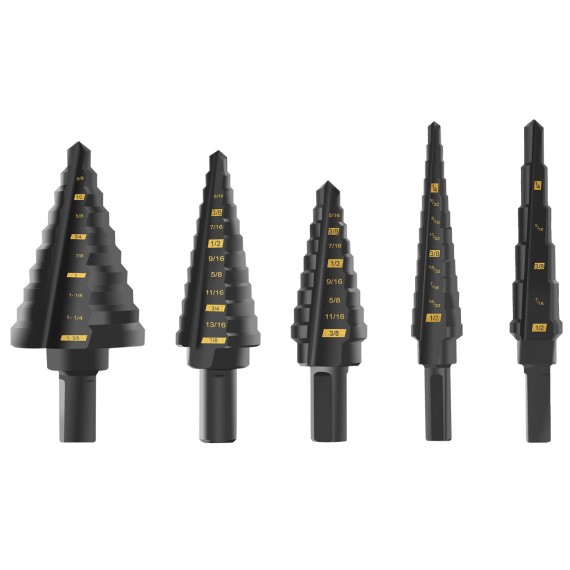Juego de brocas escalonadas fabricadas en acero rápido HSS para mayor durabilidad y resistencia.