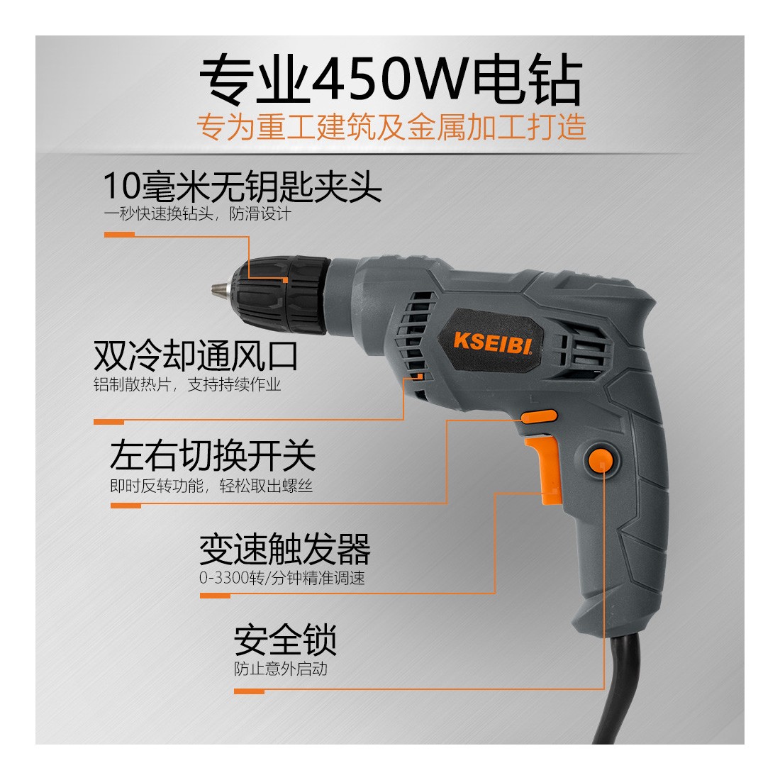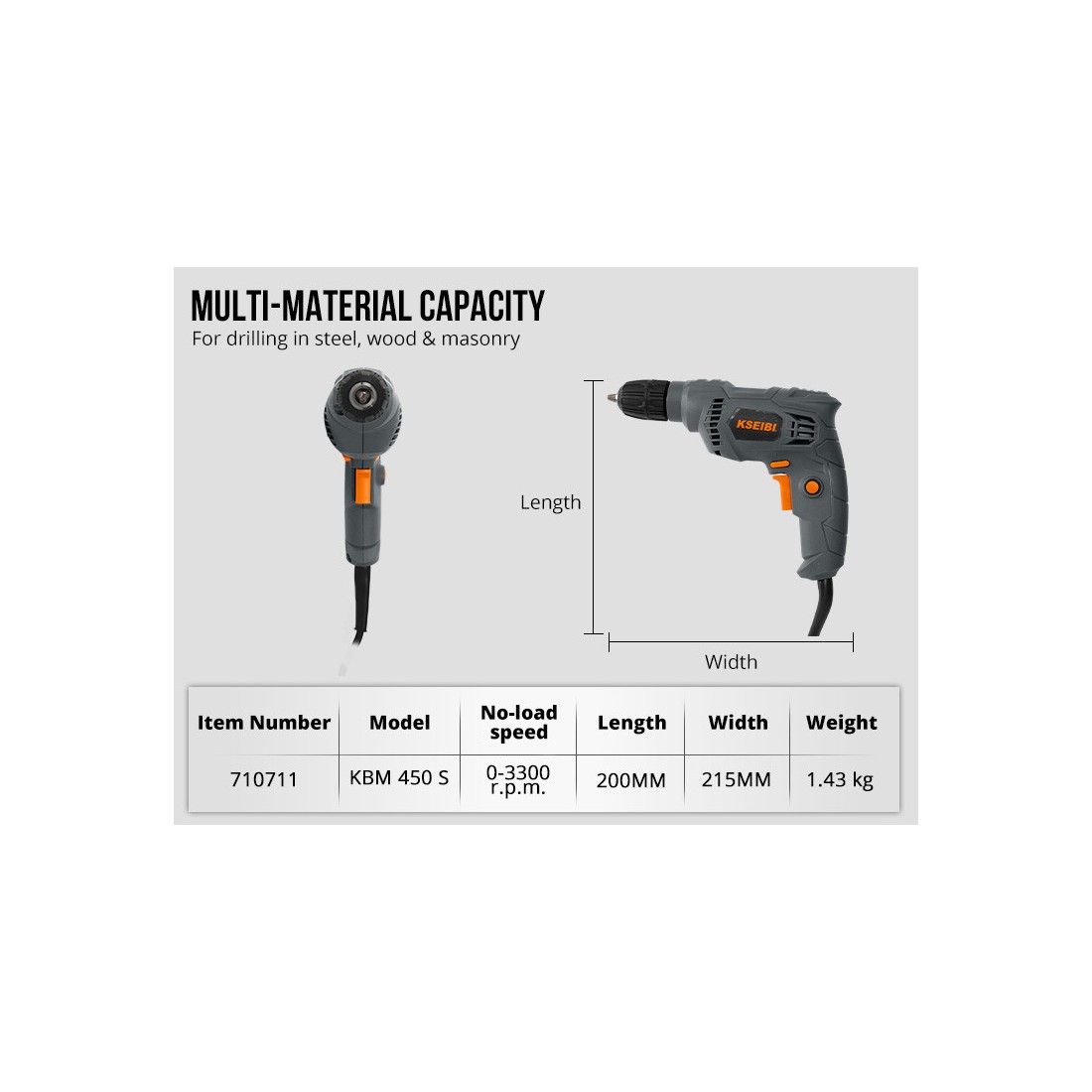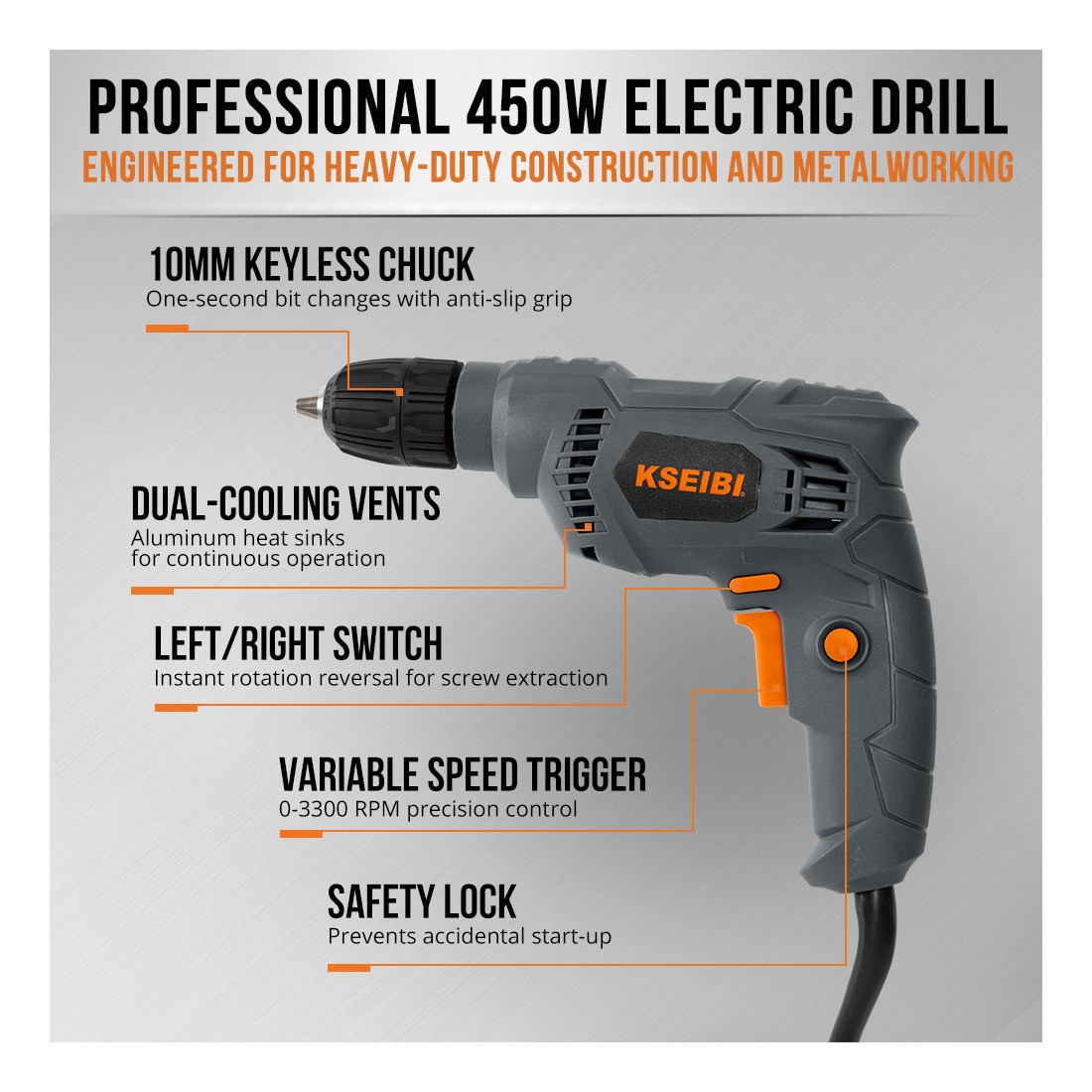 KSEIBI KBM 450 S, Taladro eléctrico 10mm sin llave, 450W
