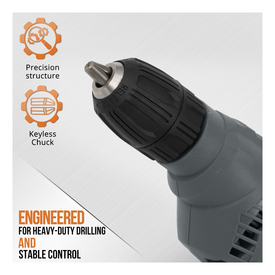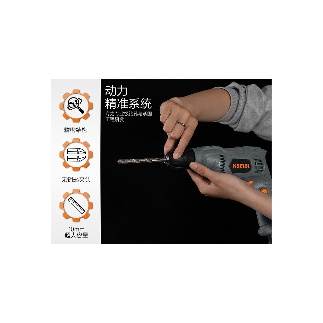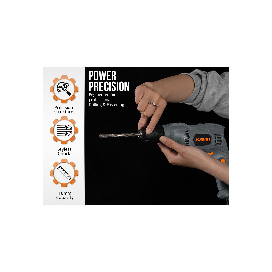 El mandril sin llave de 10 mm permite cambios rápidos y seguros de brocas, optimizando el tiempo de trabajo y reduciendo interrupciones. Su diseño ergonómico asegura un manejo cómodo, incluso en jornadas prolongadas, mientras que su construcción robusta refleja la confiabilidad que caracteriza a KSEIBI.
