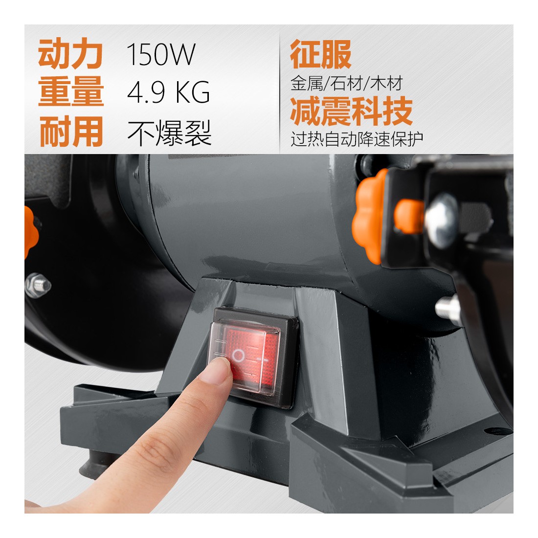 Motor de 150W para un rendimiento eficiente en trabajos de pulido y afilado.
