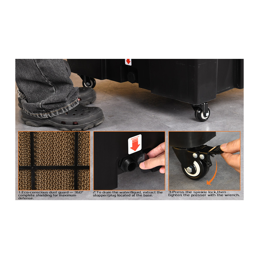Il corpo in polimero antiurto e anticorrosione resiste bene a polvere, umidità e uso intensivo. Le ruote piroettanti facilitano lo spostamento tra aree di lavoro, mentre i comandi frontali consentono regolazioni rapide del flusso d’aria. La griglia orientabile aiuta a indirizzare il getto dove serve; lo sportello frontale facilita il rabbocco e la manutenzione ordinaria.