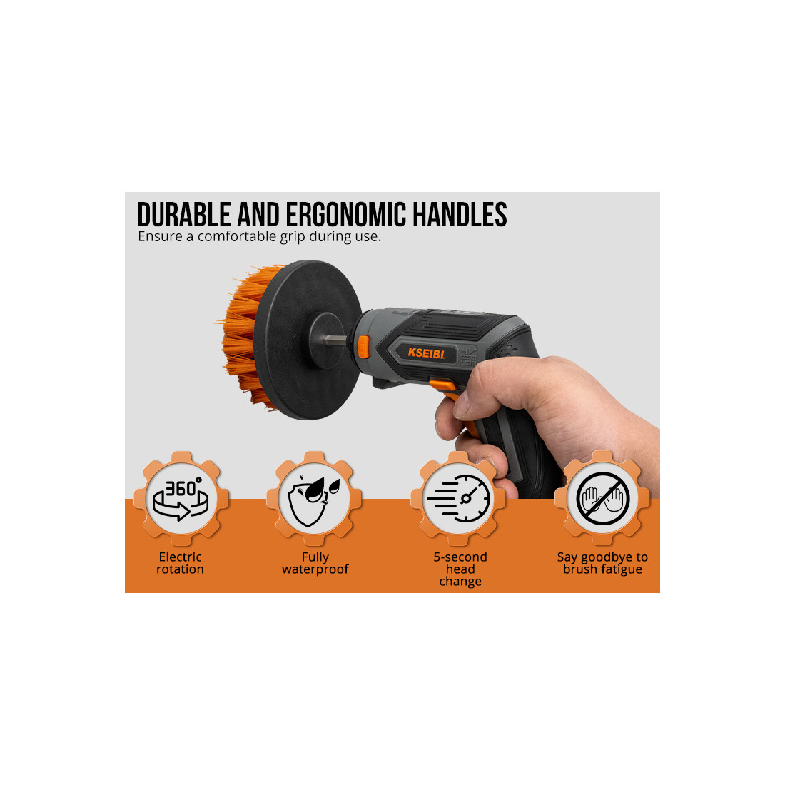 KSEIBI ドリル用クリーニングブラシ 1/4" 六角シャンク 3本組は、電動ドリルに装着して頑固な汚れや付着物を効率よく落とす清掃セット。床面、タイル目地、浴室設備、車内シートやカーペット、外壁や金属部品の洗浄まで、手作業では時間のかかる作業を短時間で均一に仕上げます。 耐摩耗性に優れた硬質ナイロン毛を採用し、水や洗剤と併用しても型崩れしにくい設計。平面用ディスク、角・際に強いコーナー用、狭所に届くシリンダー型の3タイプで、形状の異なる面を1セットでカバーします。1/4インチ六角シャンクは多くのコード式・コードレスドリルにそのまま装着可能で、安定したトルク伝達を実現。 清掃業者、設備保全、内装・原状回復、洗車・ディテーリング、ハウスクリーニングにおすすめ。耐久性・精度・信頼性で知られるKSEIBIの実用的なクリーニングソリューションです。