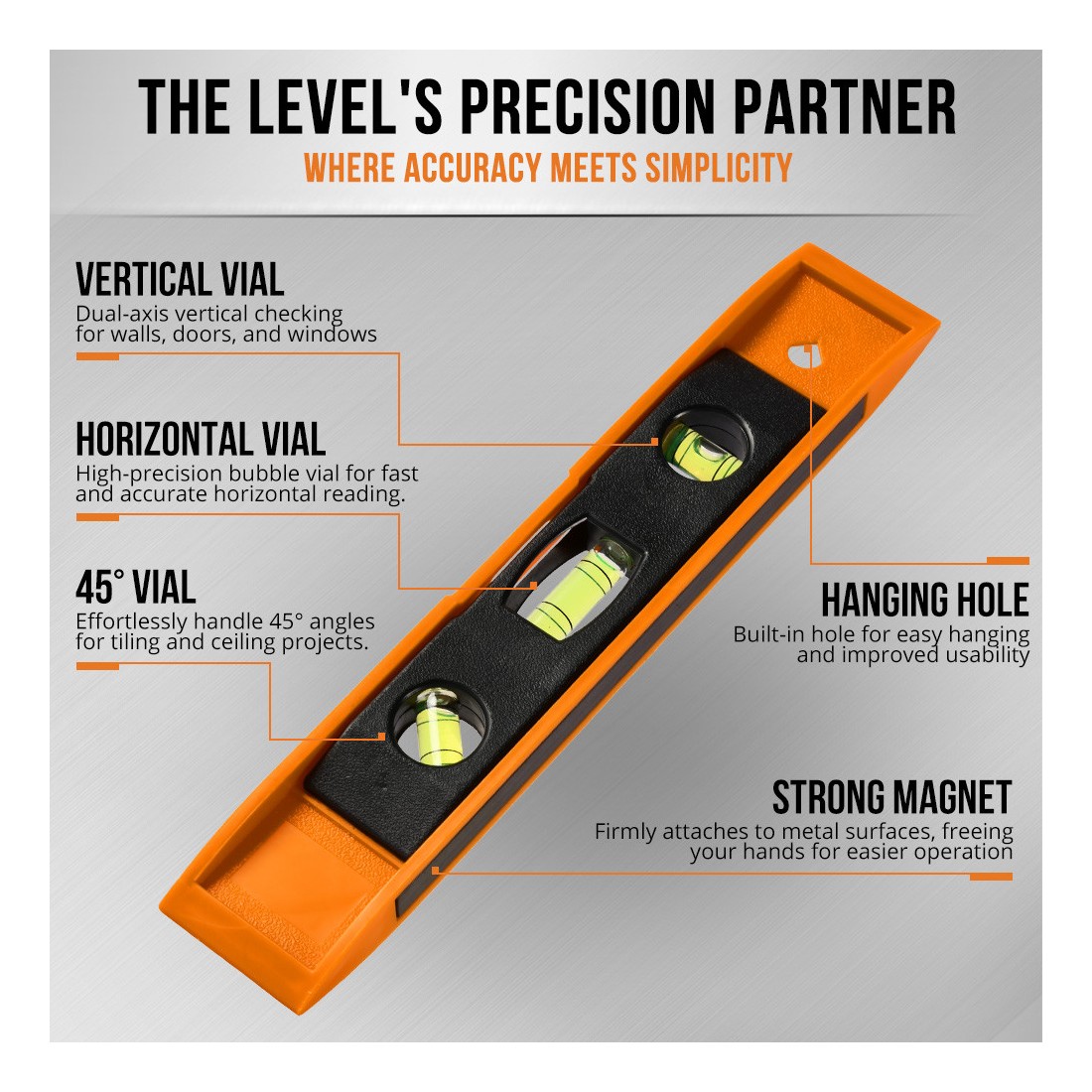 Корпус уровня изготовлен из прочного ABS-пластика, который сочетает легкость с устойчивостью к ударам и износу. Три пузырьковых колбы обеспечивают точное выравнивание по горизонтали, вертикали и под углом, упрощая выполнение задач, где требуется точность.